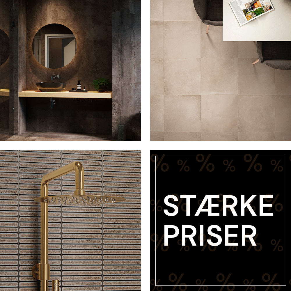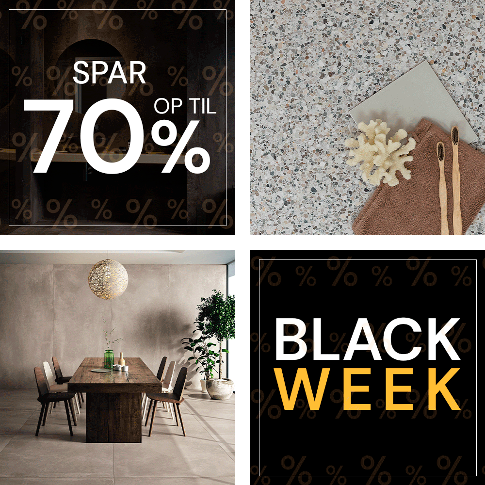 Få et indblik i de mange muligheder fra tidløse fliser og terrazzo til elegante armaturer og møbler, der løfter hele badeværelset. På mandag starter Black Week, og du kan spare helt op til 70% på udvalgte produkter – både online og i Glostrup showroomet.